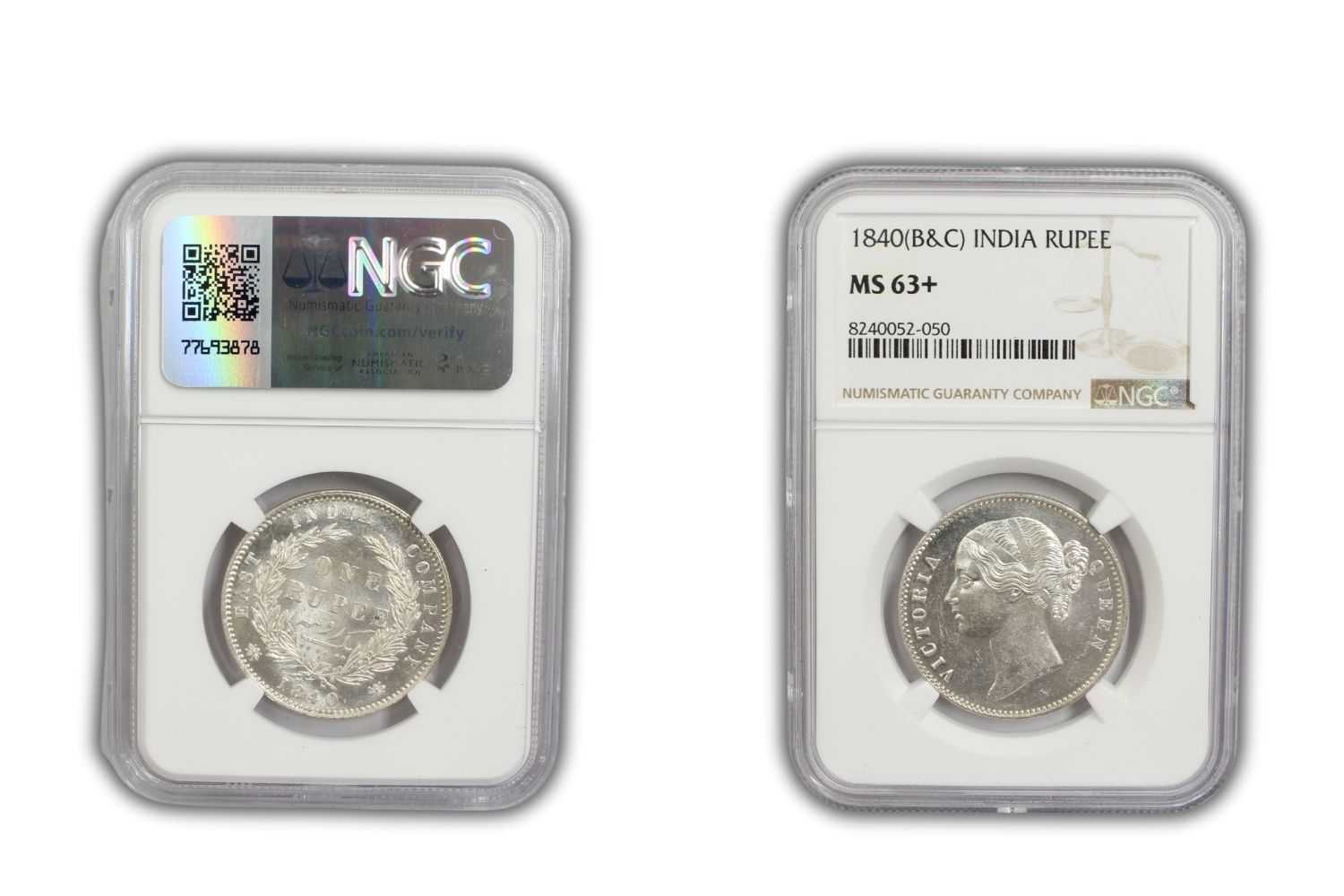 1840 India (C or B) Silver Rupee Coin NGC MS 63+