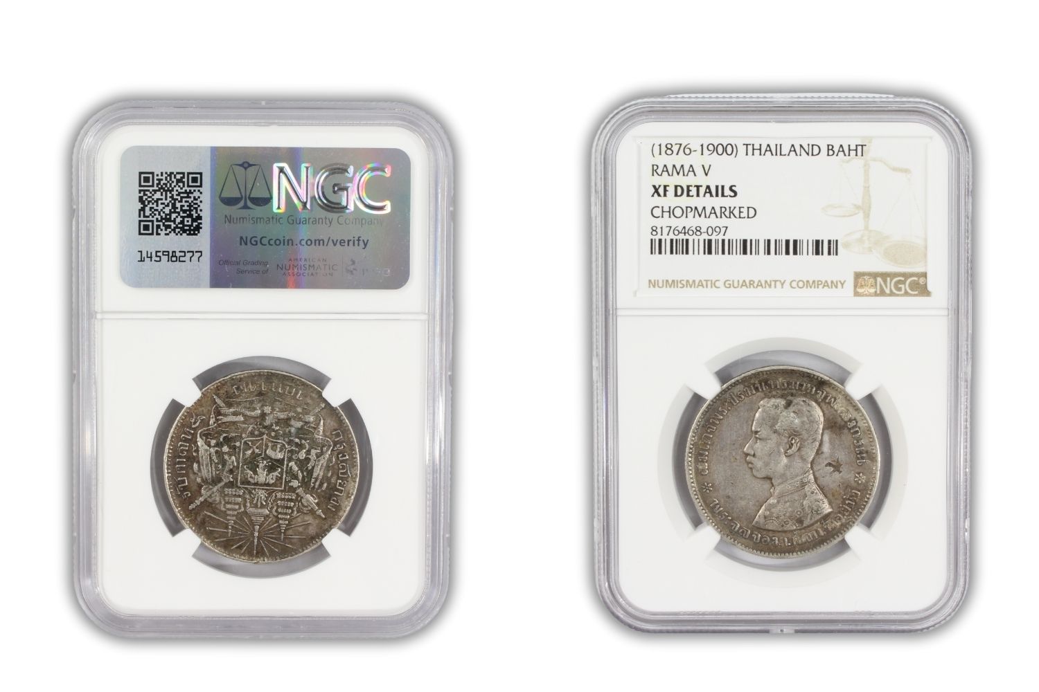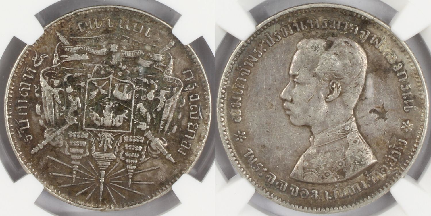 1876-1900 Thailand Bahtrama V Coin NGC XF Details Chopmarked