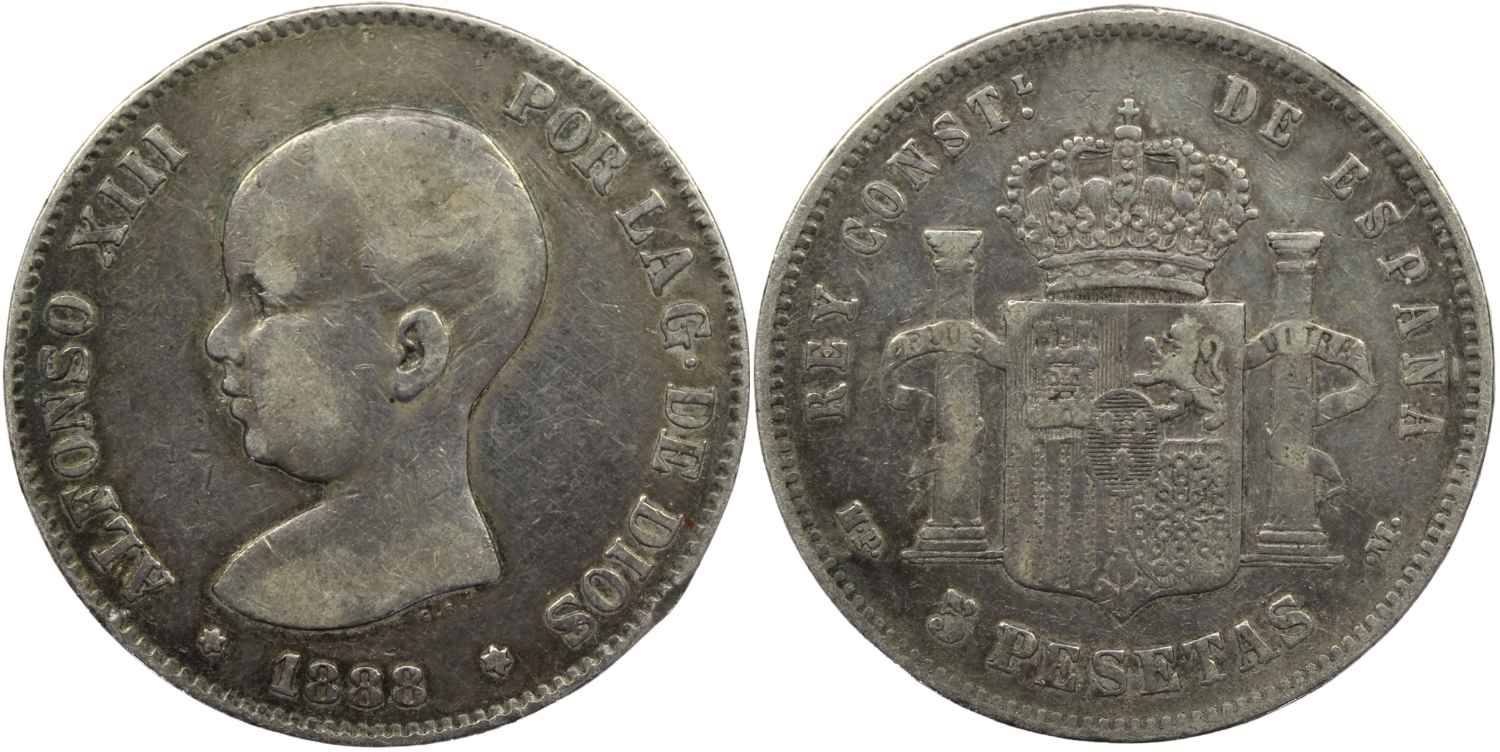 1888 Spain Silver 5 Pesetas Alfonso XIII Coin F Details