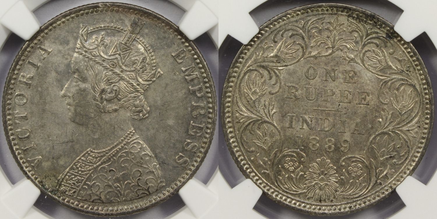 1889 B British India Silver Rupee Coin NGC MS63 Raised Mintmark