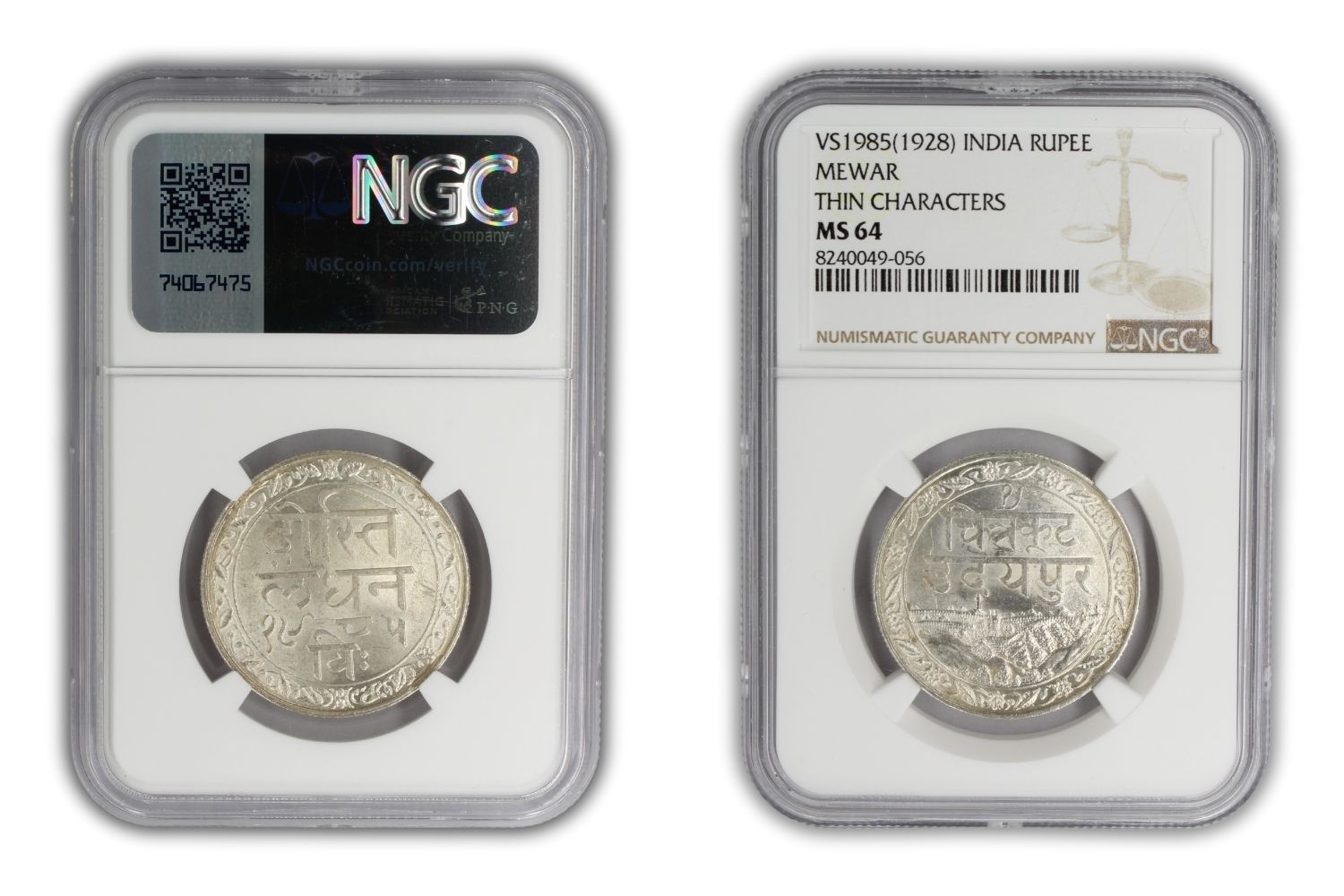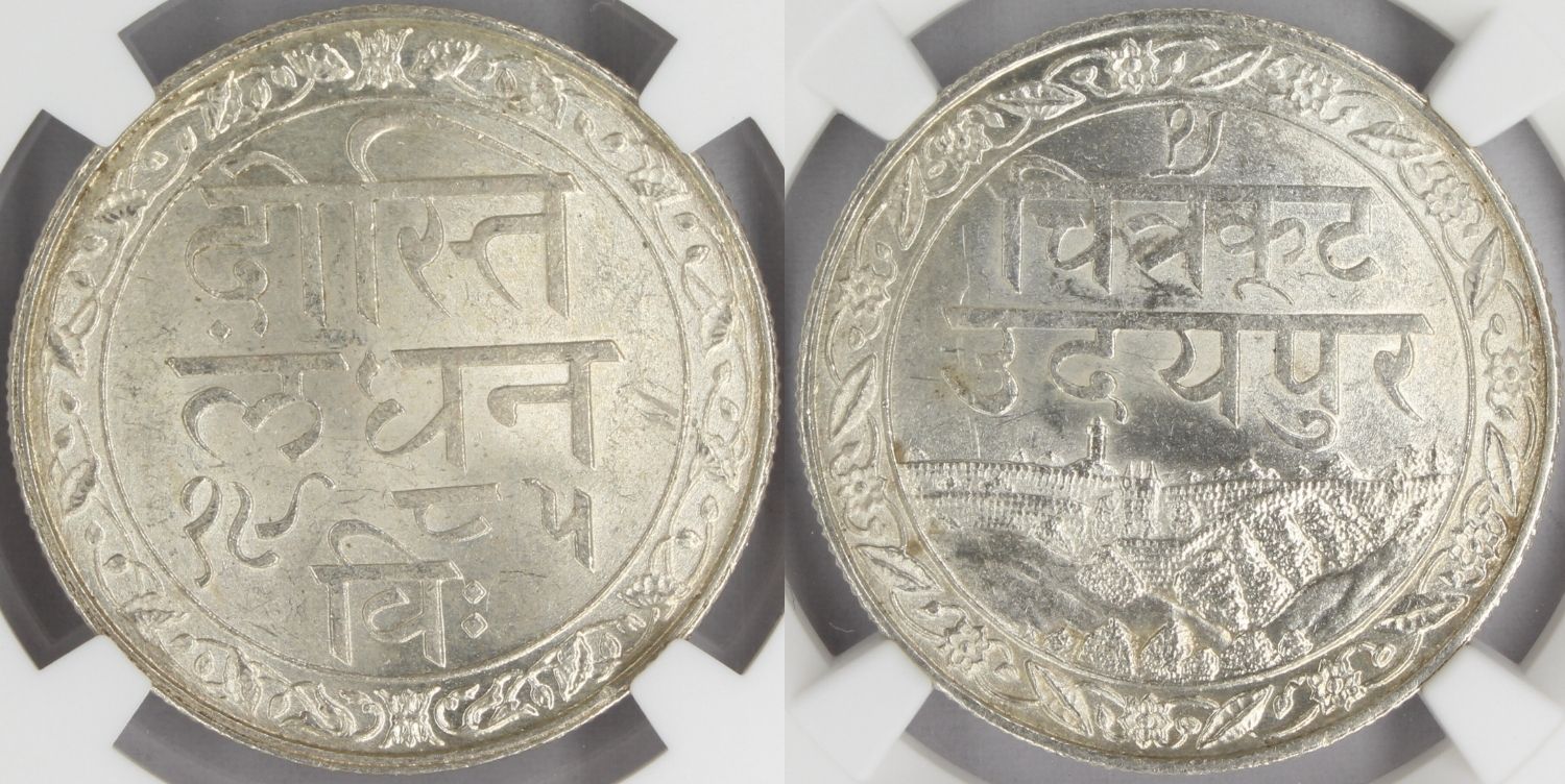 1928 India Mewar Princely State Rupee Coin NGC MS64 THIN CHARACTERS