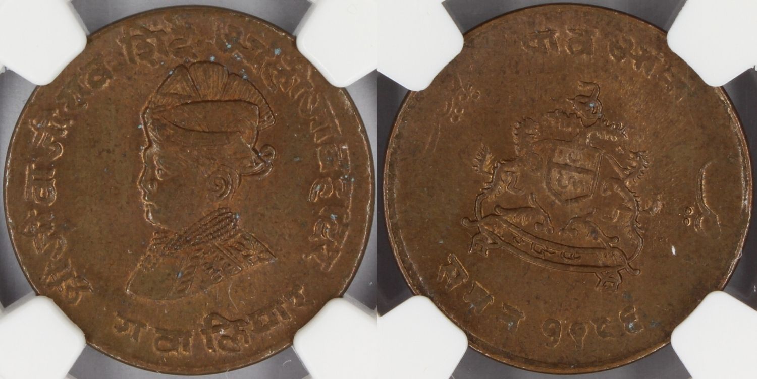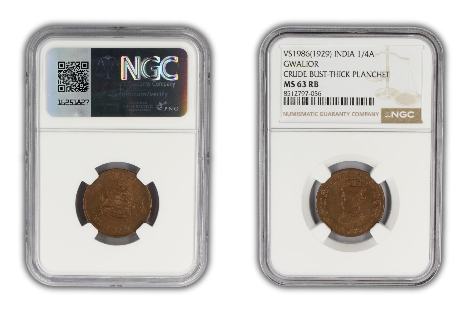1929 India Gwalior Princely State 1/4 Anna Coin NGC MS63 RB