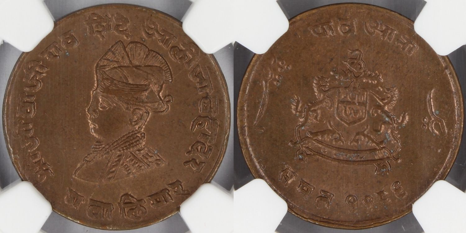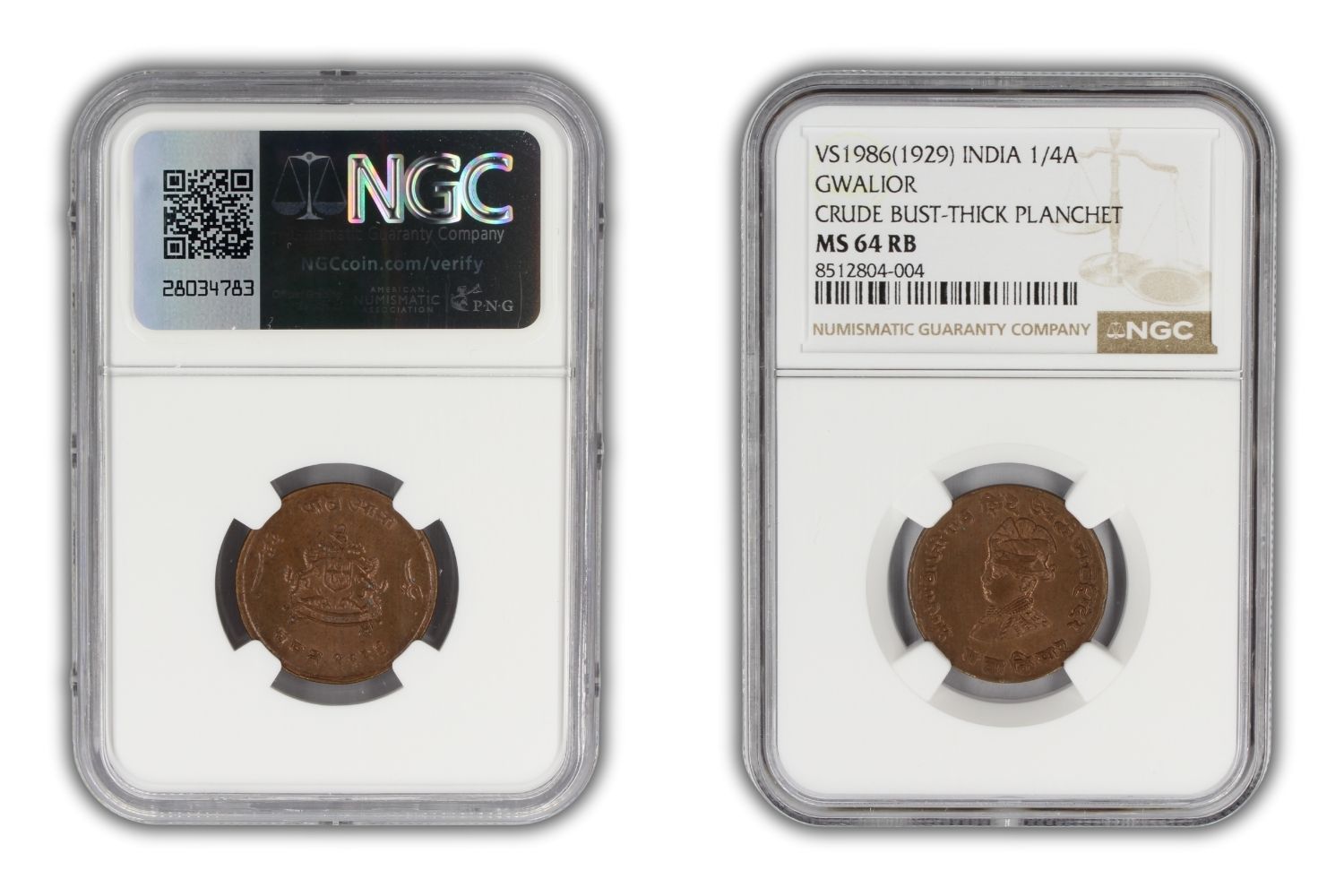 1929 India Gwalior Princely State 1/4 Anna Coin NGC MS64 RB