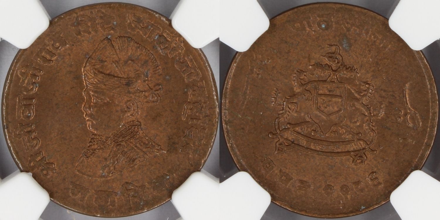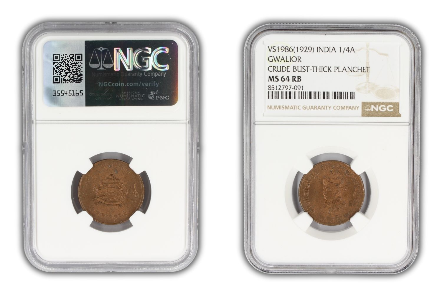 1929 India Gwalior Princely State 1/4 Anna Coin NGC MS64 RB