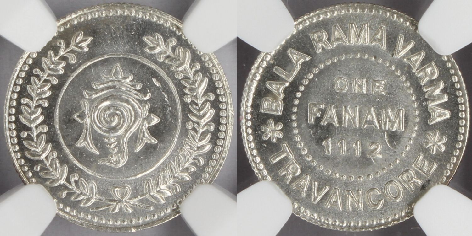 1937 (ME1112) India Silver Fanam Travancore Princely State Coin NGC MS64