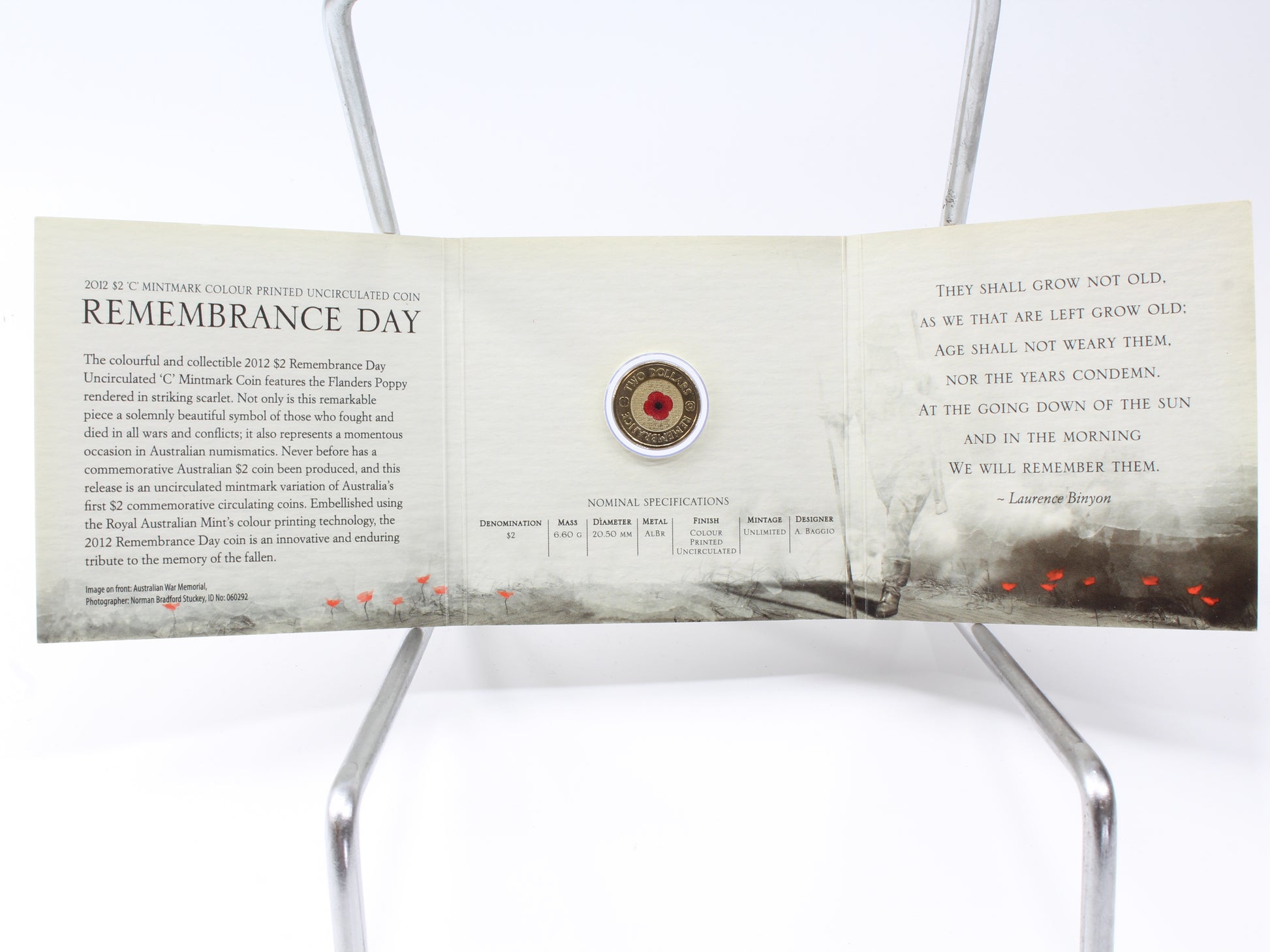 2012 Australia $2 Remembrance Day 'C' Mintmark Red Poppy Coloured Coin On Card