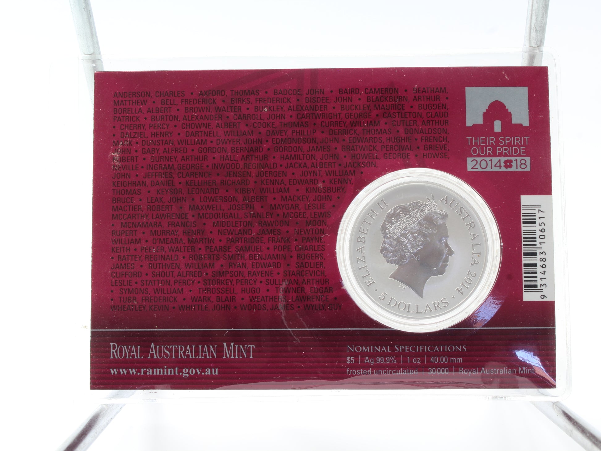 2014 $5 For Valour The Victoria Cross for Australia 1oz Silver Coin on Card